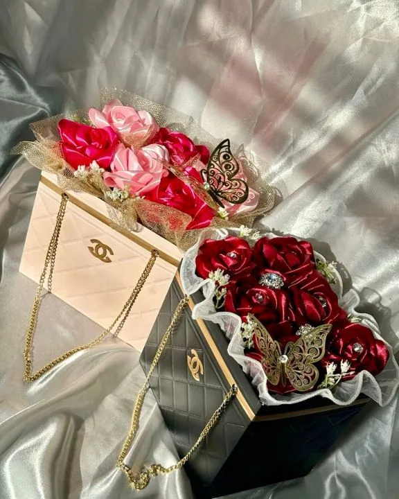 Experience a gift that radiates timeless elegance with the Eternal Glitter Satin Rose Purse from Trendizy.pk. This is not just a bouquet; it is a meticulously handcrafted masterpiece designed to capture the beauty of real flowers forever. Each delicate rose is expertly folded from high-quality satin ribbon and dusted with premium glitter for a shimmering, high-end finish.