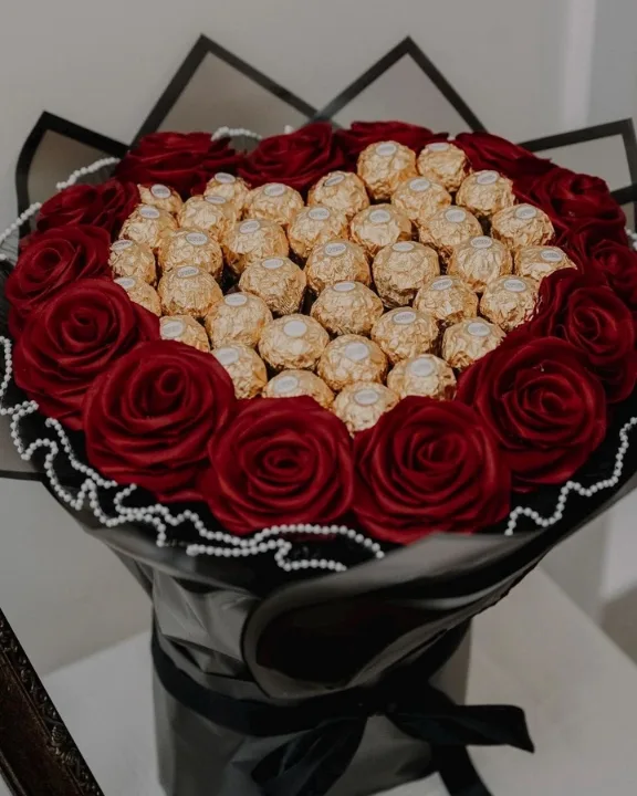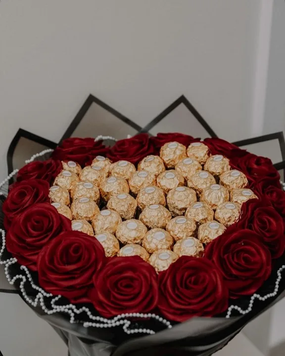 At the center of this masterpiece lies a generous heart-shaped cluster of premium Ferrero Rocher chocolates, their iconic gold foil shimmering against a backdrop of rich, velvet-textured red roses. Wrapped in sophisticated matte black paper and finished with a delicate white pearl-bead trim, this bouquet offers a high-end, modern aesthetic perfect for grand romantic gestures.