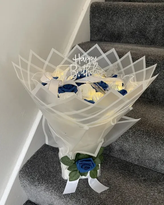 The standout feature of this arrangement is the sculptural face and hand detail nestled within the flowers, creating a “cheeky” and modern aesthetic. Wrapped in professional, high-quality paper and finished with a customizable topper, this bouquet is designed to stay beautiful forever. Because these are everlasting satin flowers, they transition perfectly from a stunning gift to a permanent piece of home decor.