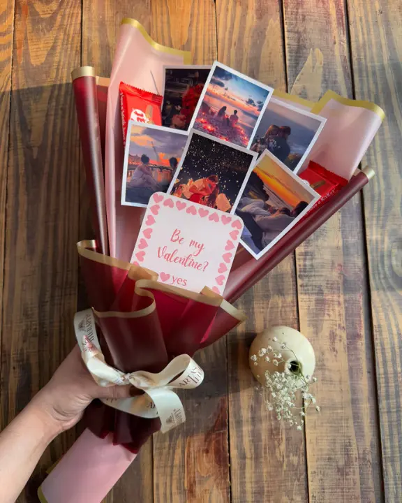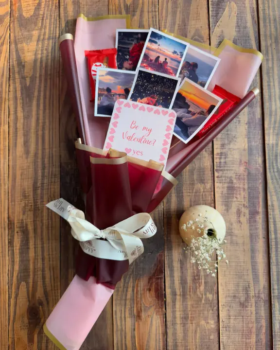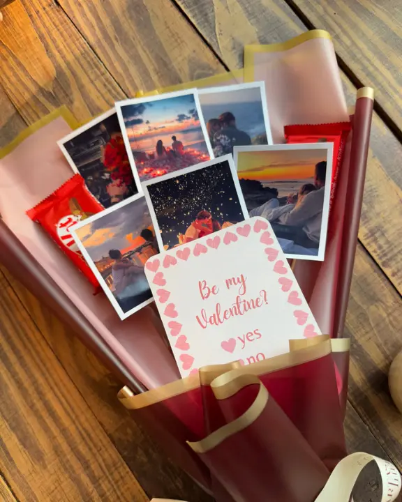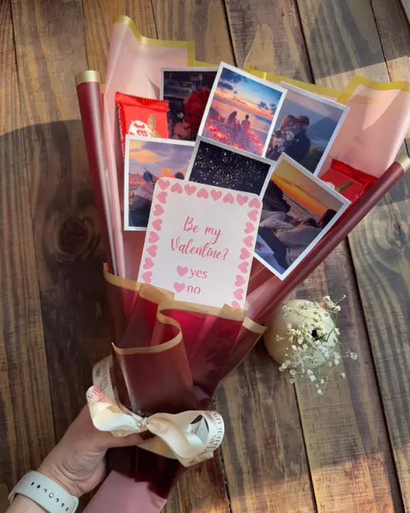 Give them a “break” they will never forget! Our Love Photo Bouquet is the ultimate mix of sweet treats and cherished memories. This arrangement features 5 of your favorite polaroid-style photos and 2 classic KitKat bars, all wrapped up in a sleek, premium black and gold aesthetic. It is the perfect, thoughtful gift for anniversaries, birthdays, or just because.
