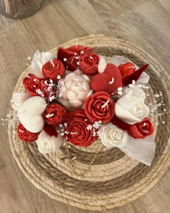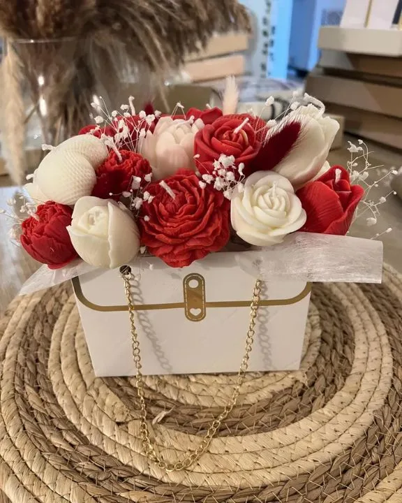 The arrangement is elegantly presented in a small white cardboard bag designed to imitate a luxury handbag, complete with a stylish gold chain strap. Inside, you’ll find a lush cluster of hand-poured candles shaped like realistic roses and blossoms. This model features a classic red and white color palette, making it a sophisticated addition to any home decor or a breathtaking centerpiece for special events.