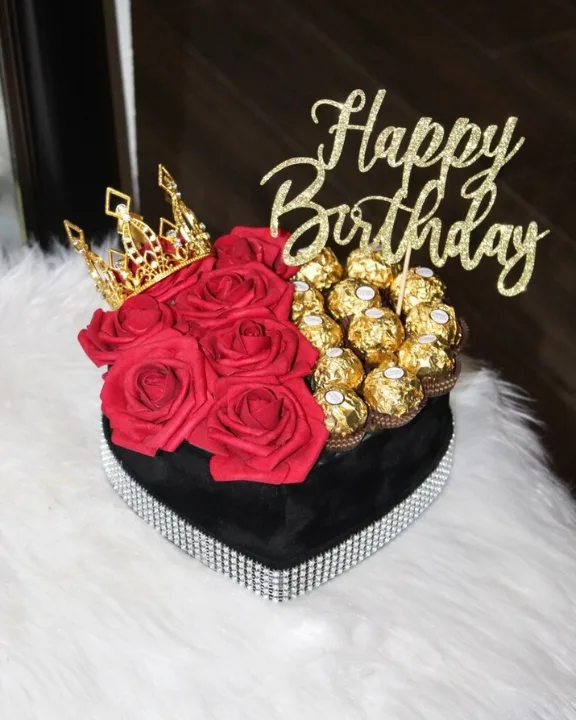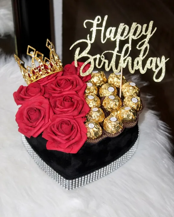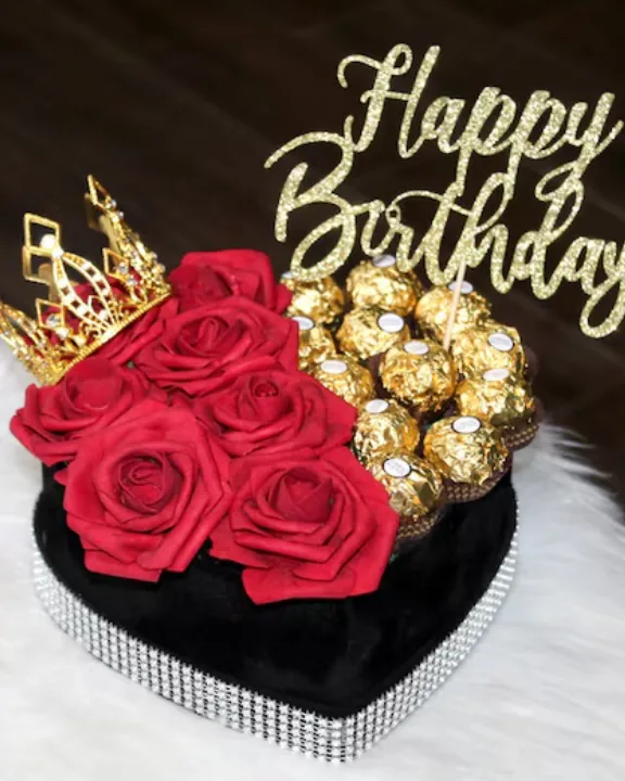 This sophisticated heart-shaped display features a lush bed of premium silk roses paired with indulgent Ferry Rose chocolates. To add a royal touch, each box is adorned with a sparkling crown and a personalized topper. Because these are high-quality silk flowers, this gift remains a beautiful, long-lasting keepsake long after the celebration ends.