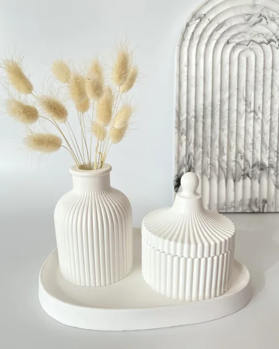 - Set Includes: “Ribbed Vase, Lidded Trinket Jar, and Decorative Dish/Tray”